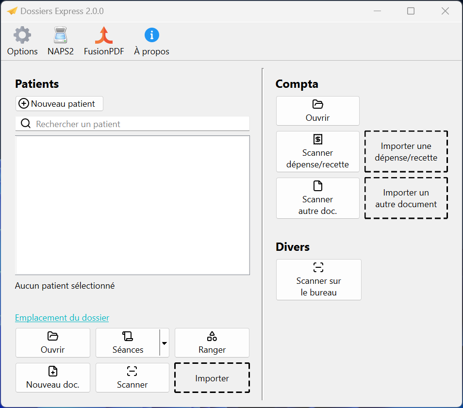 Dossiers Express est un logiciel d’aide au stockage de documents informatiques pour les dossiers patients (séances, ordonnances, mutuelles, etc.) et la compta (factures, attestations, etc.). Ce n'est pas un logiciel de gestion de cabinet ou de comptabilité.